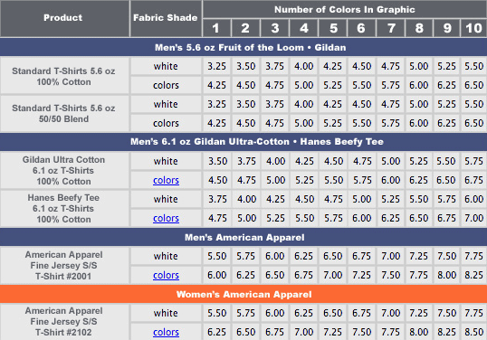 All posted prices are based on 100 qty (unless noted) and included garment and one graphic printed in one location.